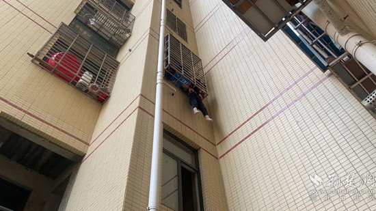 消防指戰(zhàn)員到場后發(fā)現(xiàn),男童被困在居民樓5樓窗外的防盜網(wǎng)外側(cè),腳下沒有任何緩沖支撐物。熱心鄰居正蹲在防盜網(wǎng)上緊緊抱住孩子腰部,二人都身處窗外無法動(dòng)彈,情況十分危急。
