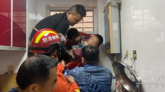 鄂州消防翻窗施救現(xiàn)場。通訊員供圖