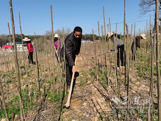 趁著晴好天氣,村民們忙著給香椿鋤草。(通訊員供圖)