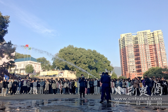 消防宣傳員為師生們“授課”。(記者 呂鑒蕾 攝)