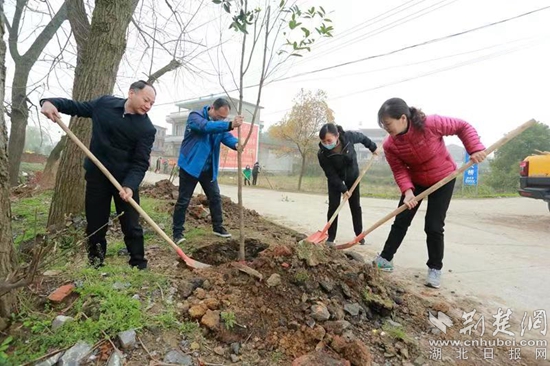 上午10時許,春光明媚,西山村村頭一派繁忙勞動景象。程珊珊、王軍與參加義務(wù)植樹活動的干部員工分工協(xié)作,干勁十足。大家三人一組,五人一群,拿上自帶的鐵鍬等工具,選坑、扶苗、培土、壓實、澆水,大家齊心協(xié)力,各個環(huán)節(jié)銜接有序。經(jīng)過1個多小時的辛勤勞作,共栽種桂花樹等樹苗120多棵。一排排新栽下的樹苗昂然挺立,為西山村增添了一抹新綠。