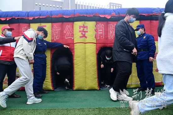 師生們在火場逃生帳篷體驗區(qū),學習黑暗環(huán)境下的火場逃生。(通訊員供圖)