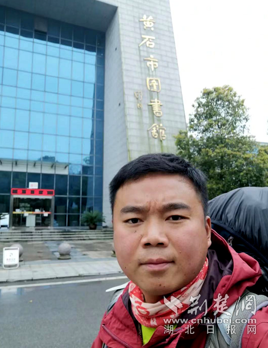 荊楚網(wǎng)(湖北日報網(wǎng))訊 (記者呂鑒蕾 阮瓊)3月19日下午7點,鄂州市圖書館前,一位背包客舉起自拍桿,“咔嚓”一聲,鄂州市圖書館幾個大字和背包客風塵仆仆的身影定格在這一刻。