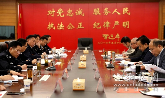黃石市委常委、市紀(jì)委書記、市監(jiān)委主任楊軍一行在市公安局調(diào)研。記者 熊子璇 攝