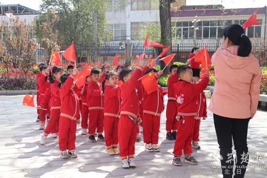 麻城市幼兒園師生演唱《國旗國旗我愛你》等歌曲。通訊員供圖