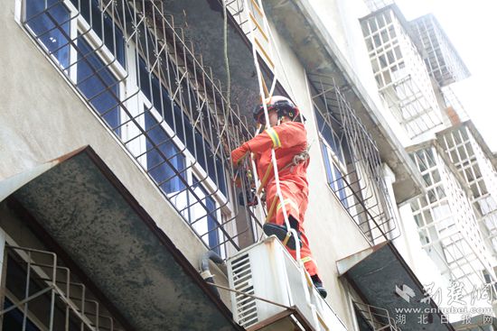 消防員第一時間趕到現(xiàn)場,報警人成先生家是一棟四層自建房,小女孩被鎖在3樓,成先生的妻子在門口急得團團轉(zhuǎn)。經(jīng)過一番偵察,消防員發(fā)現(xiàn)三樓窗子的防盜網(wǎng)可以打開,在征得住戶同意后,便拿來消防軟梯并做好安全防護,在其他隊友的幫助下,消防員化身“蜘蛛俠”從四樓頂降至3樓窗戶口,站在窗戶外的空調(diào)機上,利用角磨機將鎖打開,順利進入房間,僅用20分鐘就成功開門將小女孩救出。