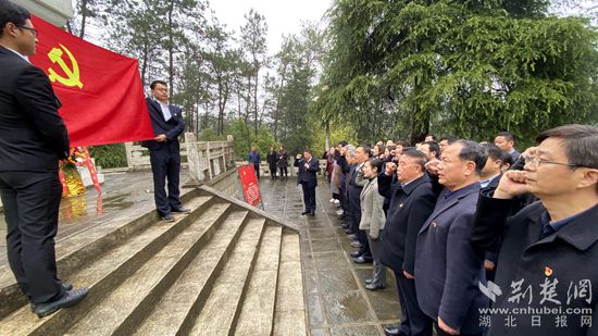 蒙蒙細(xì)雨中,青松翠柏掩映下的烈士陵園莊嚴(yán)、肅穆。全體黨員身著正裝佩戴黨徽,向革命烈士紀(jì)念碑進(jìn)獻(xiàn)花籃并默哀。紀(jì)念碑前,大家齊唱國(guó)歌,重溫入黨誓詞,鏗鏘的誓言久久回響。