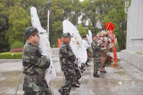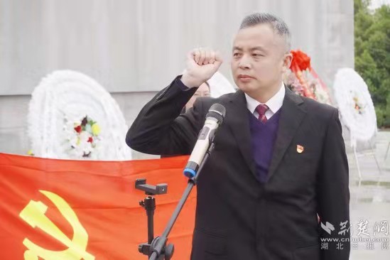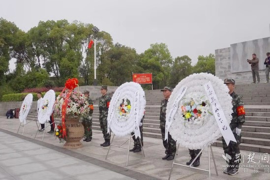 上午10時30分,百余黃石退役軍人代表們在烈士紀念碑前,全體默哀一分鐘,向革命先烈敬獻花籃、花圈,瞻仰烈士紀念群雕,深切悼念革命英烈。面對鮮紅的黨旗,黨員代表們右手握拳,重溫入黨誓詞,鏗鏘有力的誓言響徹革命烈士陵園。
