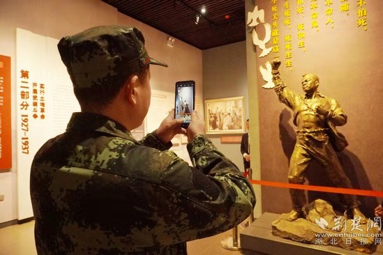 退役軍人代表用手機記錄革命先烈雕像。熊子璇 攝