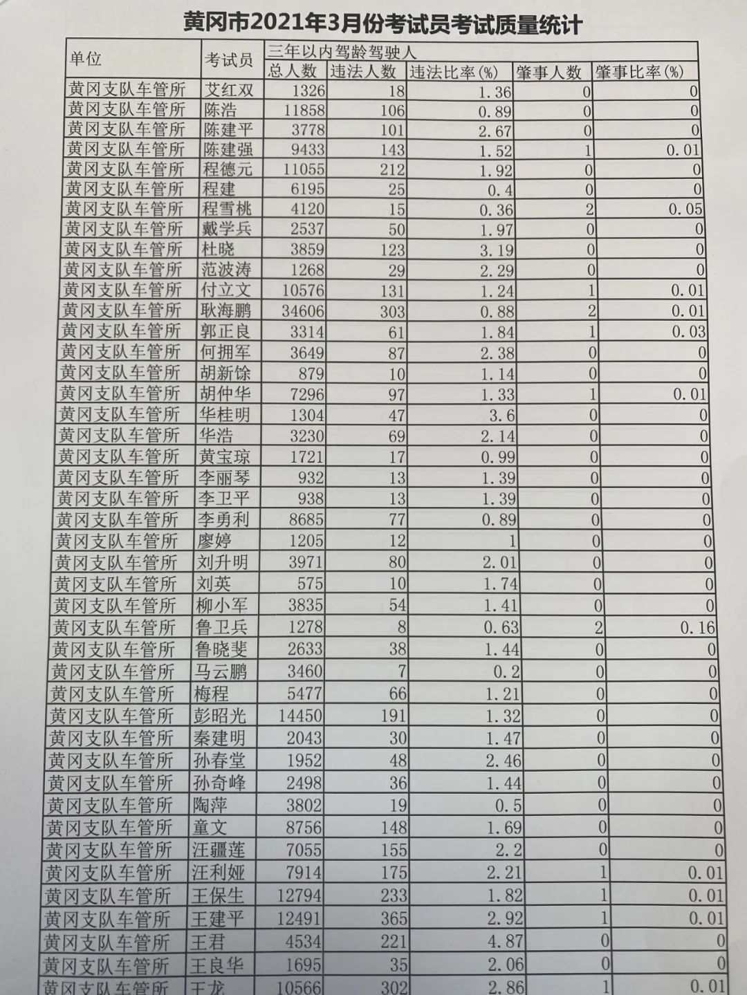 荊楚網(wǎng)(湖北日報(bào)網(wǎng))訊(記者劉璐)4月6日,記者從黃岡市公安局交通警察支隊(duì)獲悉,2021年3月黃岡市駕校培訓(xùn)質(zhì)量及考試員考試質(zhì)量統(tǒng)計(jì)表公布。通過一覽表,市民可看到黃岡73家駕校培訓(xùn)質(zhì)量以及77名考試員考試質(zhì)量。