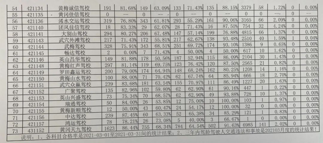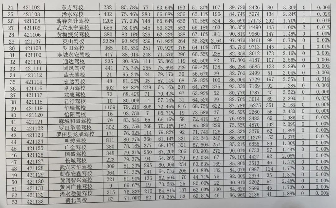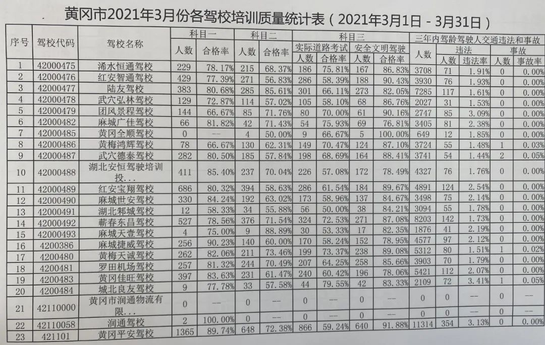 按照考試合格率,科目一前三名為潤通駕校、藍(lán)天駕校、英山駕校;科目二前三名麻城天壹駕校、怡陽駕校、陸友駕校;科目三實(shí)際道路考前三名為黃岡廣佳駕校 、城北良友駕校、黃梅紅聲駕校;科目三安全文明駕駛前三名為瑞通駕校、黃岡全順駕校、黃梅新順駕校。從三年內(nèi)駕齡駕駛?cè)私煌ㄟ`法率來看,團(tuán)風(fēng)佳信駕校最高,達(dá)4.24%。