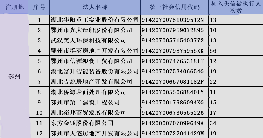 荊楚網(wǎng)(湖北日報網(wǎng))訊(記者熊子璇 通訊員王惠敏)4月7日,記者從鄂州市發(fā)展和改革委員會了解到,近日,該委公布了鄂州市失信黑名單的12家企業(yè),且這些企業(yè)被人民法院納入了“失信被執(zhí)行人名單”10次以上。其中,鄂州市群英房地產(chǎn)開發(fā)有限公司被納入“失信被執(zhí)行人名單”高達(dá)56次。