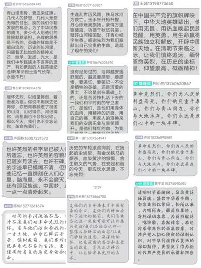 據(jù)悉,本次活動(dòng)由該校漢語(yǔ)言文學(xué)2001班副團(tuán)支書劉浩負(fù)責(zé)組織,全班同學(xué)共同參與?!扒迕髦H,讓我們向所有為民族獨(dú)立、人民幸福而犧牲的英雄先烈們致敬,人民英雄永垂不朽!”隨著副團(tuán)支書劉浩發(fā)出第一段文字,同學(xué)們紛紛將自己對(duì)英雄先烈們的緬懷之詞編輯成文字發(fā)在班群中,全班43名同學(xué)相繼發(fā)出文段,一時(shí)間班群消息不斷。班級(jí)全體同學(xué)認(rèn)真參與,運(yùn)用文字寄托哀思。同學(xué)們真情流露,字里行間皆對(duì)英雄先烈表達(dá)深切哀思。