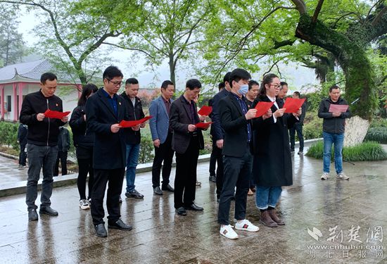 4月2日,在柳林鄉(xiāng)烈士陵園里,縣扶貧辦全體黨員身著正裝佩戴黨徽,向革命烈士紀念碑敬獻花籃并默哀,還齊聲朗誦黃梅籍革命英烈王達強的詩歌《七歌》。