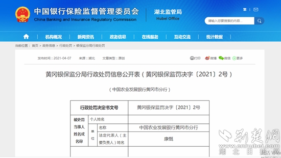 荊楚網(wǎng)(湖北日?qǐng)?bào)網(wǎng))訊(記者阮瓊)4月7日,中國(guó)銀行保險(xiǎn)監(jiān)督管理委員會(huì)黃岡監(jiān)管分局發(fā)布公告,因?qū)①J款業(yè)務(wù)中產(chǎn)生的押品評(píng)估費(fèi)轉(zhuǎn)嫁給借款企業(yè)承擔(dān),中國(guó)農(nóng)業(yè)發(fā)展銀行黃岡市分行被罰款20萬(wàn)元。