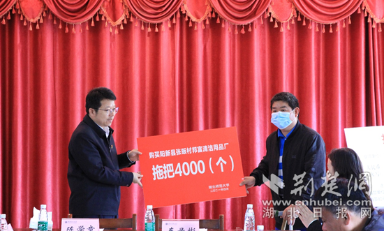 湖北師范大學(xué)校長李宏代表學(xué)校將4000把拖把訂單送給邦富拖把廠廠長張炳煒。通訊員供圖