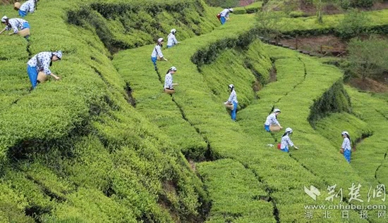 在綠意盎然的茶園內(nèi)采茶的采茶女。記者胡小軍 攝