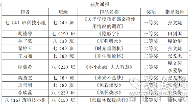 其中,七(4)班張文捷老師指導(dǎo)的作品《關(guān)于學(xué)校教室課桌椅使用情況的調(diào)查》(作者:七(4)班科技小組)、七(19)班田劍國老師指導(dǎo)的作品《隱形字》(作者:胡德睿),榮獲一等獎。此外,該校獲得二等獎作品4件,三等獎作品4件。