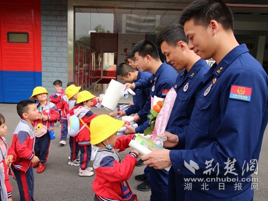 萌娃們將自己親手畫(huà)的“烈火英雄”和鮮花獻(xiàn)給消防人員。(通訊員供圖)