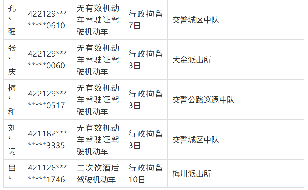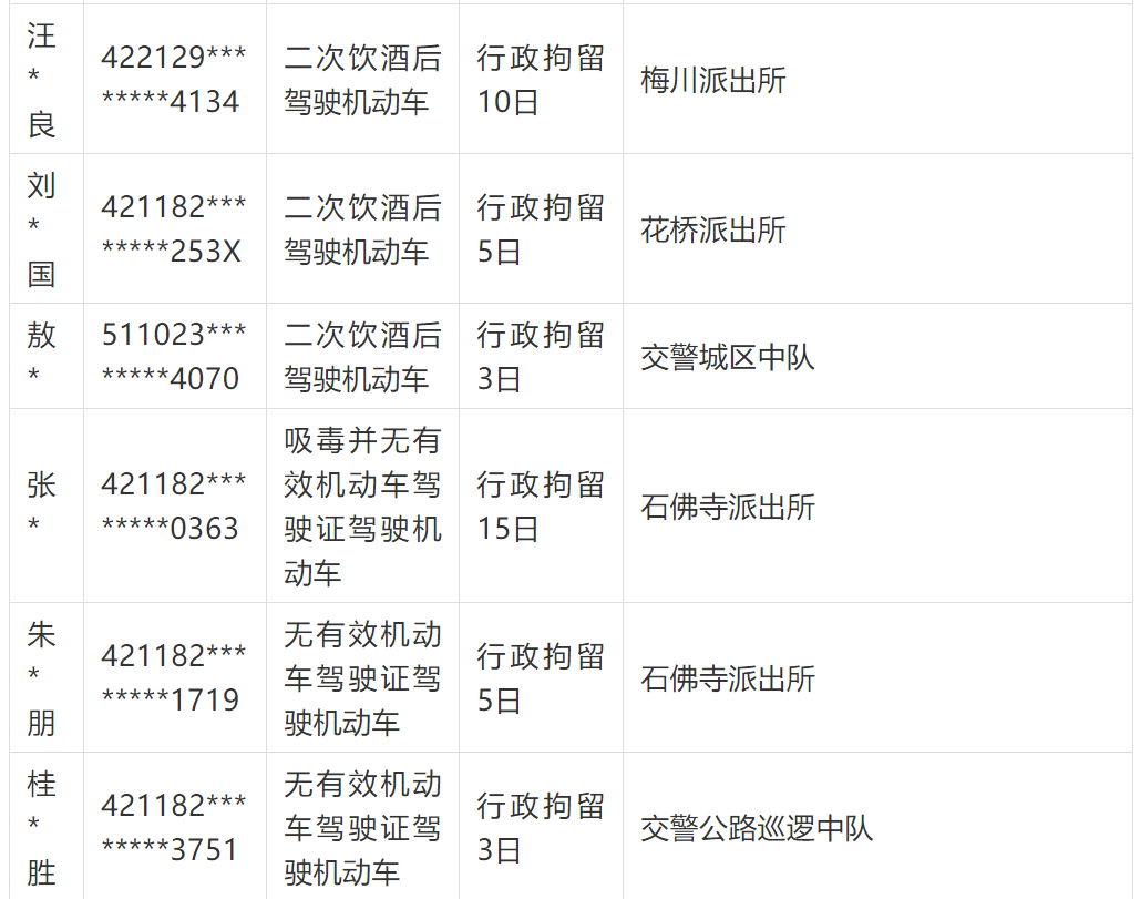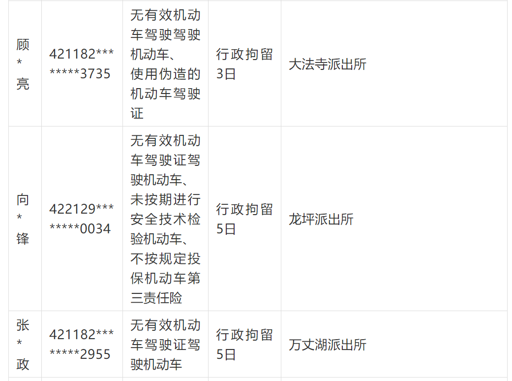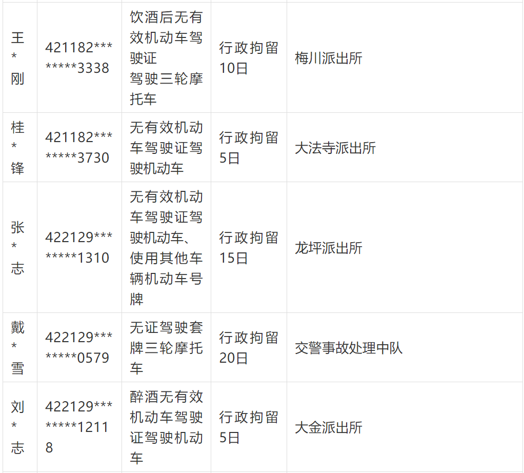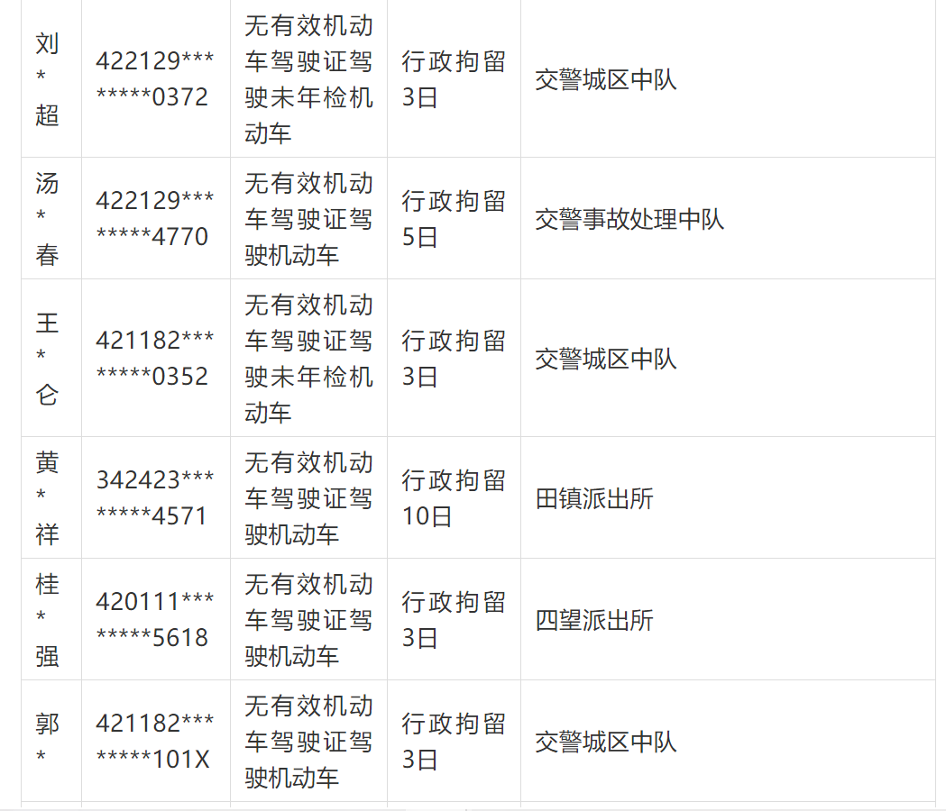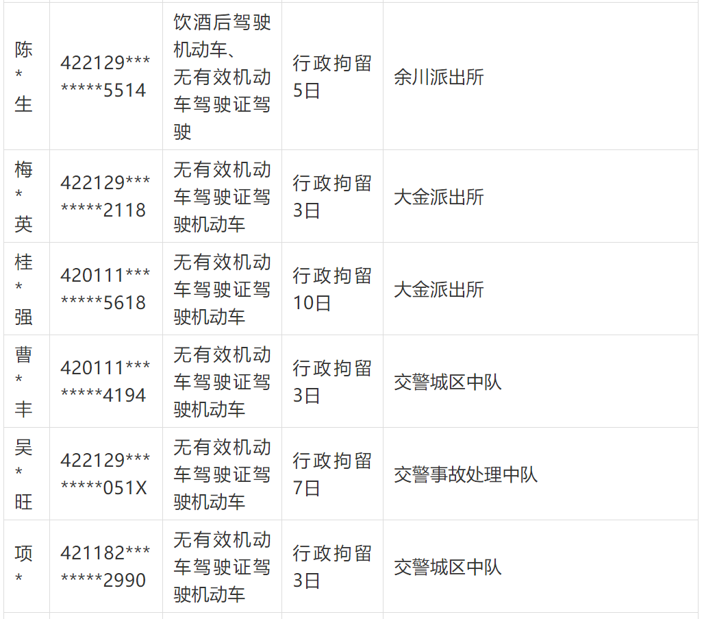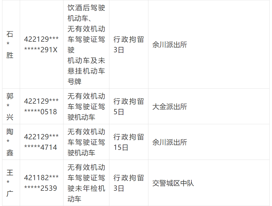 荊楚網(wǎng)(湖北日?qǐng)?bào)網(wǎng))訊(記者熊子璇 通訊員羅豪)4月29日,黃岡武穴市公安局交警大隊(duì)曝光該市1至4月份嚴(yán)重交通違法名單,共有90人。其中,51人因無(wú)有效機(jī)動(dòng)車駕駛證駕駛機(jī)動(dòng)車、二次飲酒后駕駛機(jī)動(dòng)車或交通肇事等被處以行政拘留處罰,39人因交通肇事或醉酒駕駛等被刑事拘留。