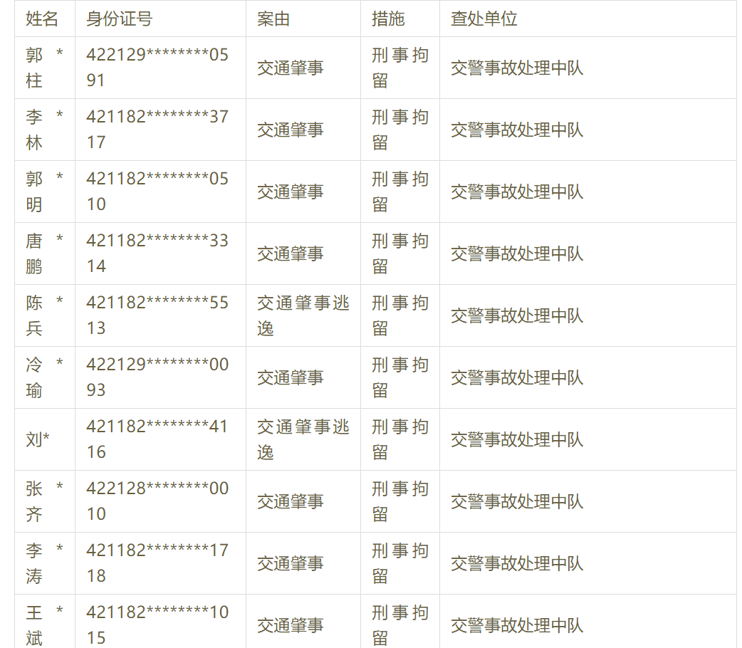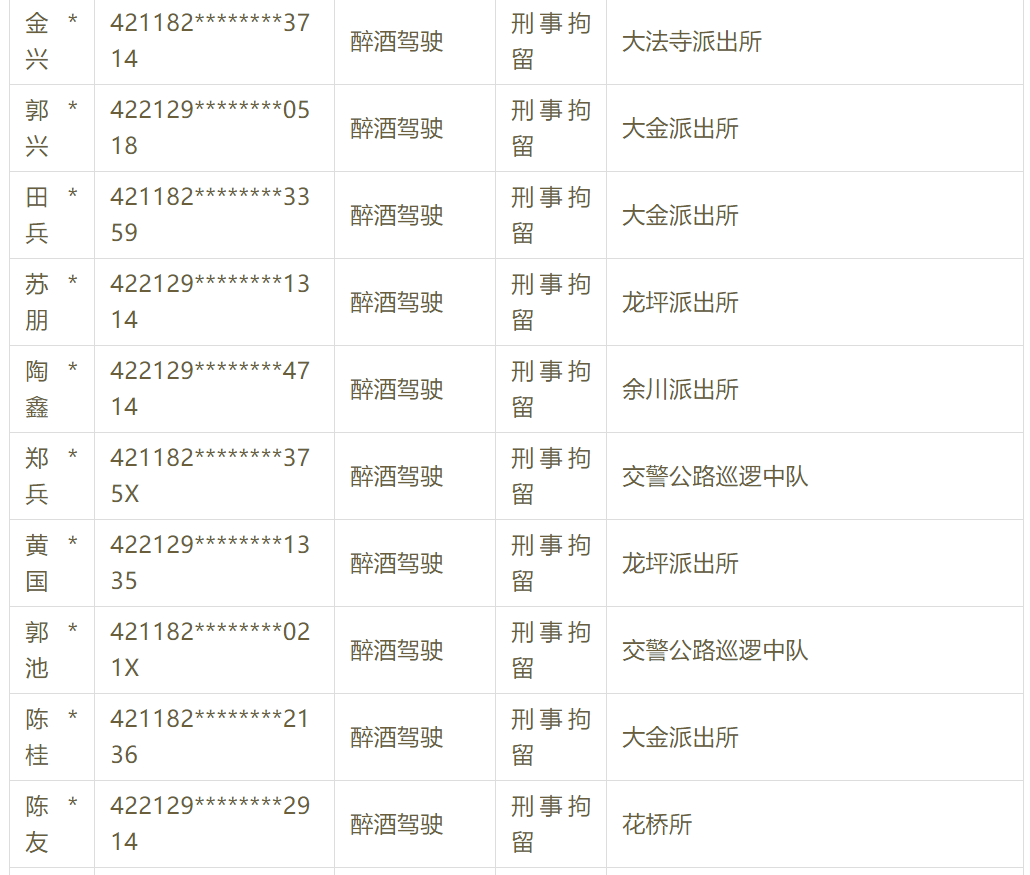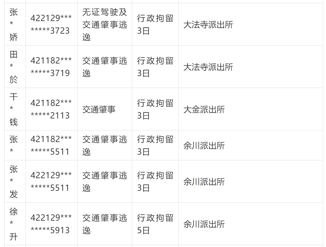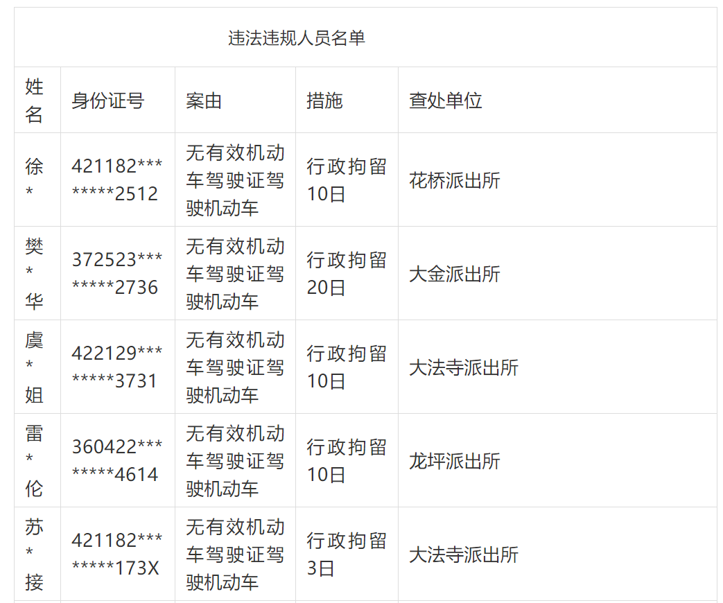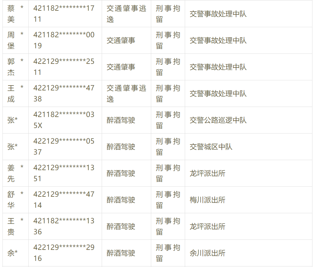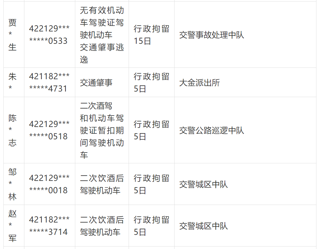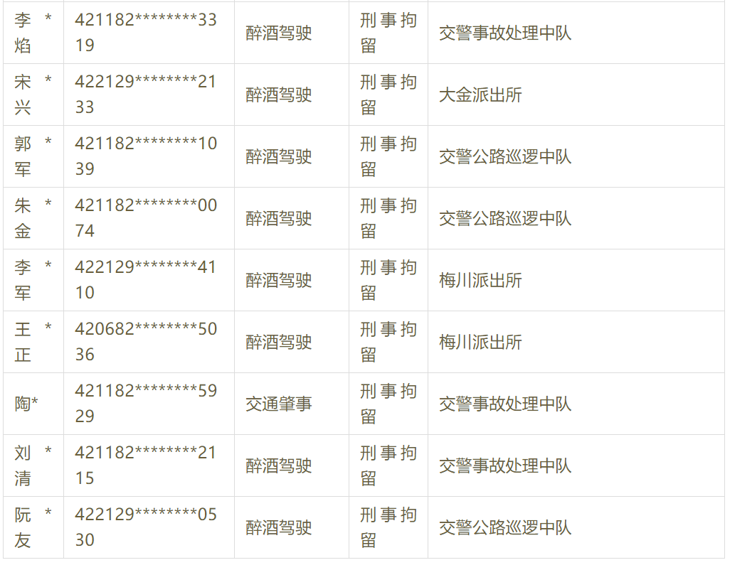 荊楚網(wǎng)(湖北日?qǐng)?bào)網(wǎng))訊(記者熊子璇 通訊員羅豪)4月29日,黃岡武穴市公安局交警大隊(duì)曝光該市1至4月份嚴(yán)重交通違法名單,共有90人。其中,51人因無(wú)有效機(jī)動(dòng)車駕駛證駕駛機(jī)動(dòng)車、二次飲酒后駕駛機(jī)動(dòng)車或交通肇事等被處以行政拘留處罰,39人因交通肇事或醉酒駕駛等被刑事拘留。