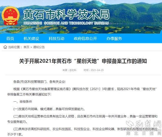 黃石市科技局發(fā)布開展2021年黃石市“星創(chuàng)天地”申報備案工作的通知。來源:黃石市科技局官網(wǎng)