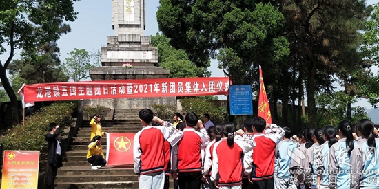 上午9時許,入團儀式在慷慨激昂的國歌伴奏中拉開序幕。四所中學(xué)的110名新老團員列隊等候。在革命烈士紀念碑前,新團員們面對團旗,莊嚴誓詞,老團員代表為新團員們佩戴團徽,4名新、老團員代表分別作了感想發(fā)言。