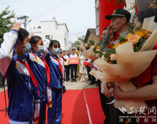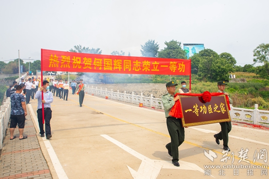 活動(dòng)現(xiàn)場,筆者看到,工作人員依次列隊(duì),舉著“熱烈祝賀何國輝同志榮立一等功”橫幅,手捧“一等功喜報(bào)、部隊(duì)獎(jiǎng)勵(lì)金、麻城市獎(jiǎng)勵(lì)金、綬帶和大紅花”,送喜報(bào)隊(duì)伍浩浩蕩蕩走向何國輝老家,在其家門口舉行了濃重的送喜報(bào)儀式,“一等功臣之家”牌匾耀眼奪目,吸引了眾多村民,大家都來分享這份難得的喜悅。