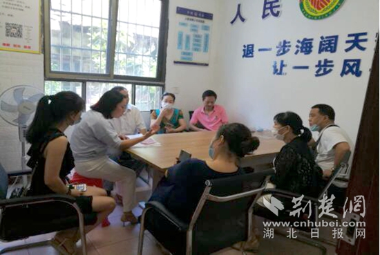 黃石港街道調(diào)委會(huì)主任劉學(xué)群調(diào)解覆盆山社區(qū)居民樓房漏水糾紛。通訊員供圖