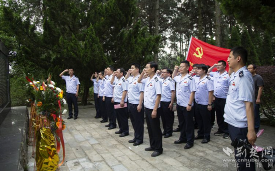 在宛希先、宛希儼革命烈士紀(jì)念碑前,黃梅縣稅務(wù)局黨委委員、副局長胡勇,縣稅務(wù)局黨委委員、副局長貢文彬,仔細(xì)整理花籃緞帶。全體黨員面向紀(jì)念碑肅立,向宛希先、宛希儼烈士和已故革命先輩默哀致敬,并在鮮紅的黨旗下,舉起右手,重溫入黨誓詞。