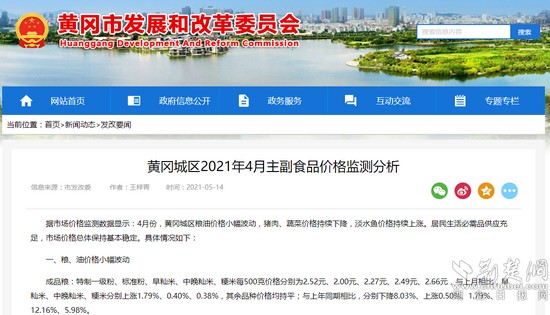 荊楚網(wǎng)(湖北日報網(wǎng))訊(記者熊子璇 通訊員王梓青)記者5月19日從黃岡市發(fā)改委官網(wǎng)獲悉,近日,黃岡市發(fā)改委公布4月份城區(qū)主要農(nóng)副食品價格監(jiān)測數(shù)據(jù)。最新數(shù)據(jù)顯示,當(dāng)前,黃岡城區(qū)糧油價格小幅波動,豬肉、蔬菜價格持續(xù)下降,淡水魚價格持續(xù)上漲。