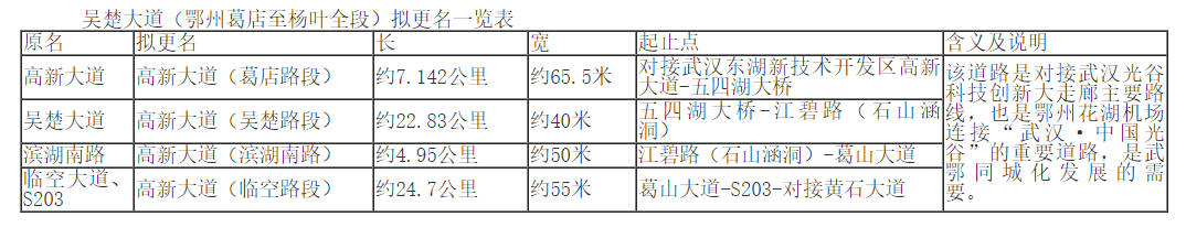 附:吳楚大道”(鄂州葛店至楊葉全段)擬更名一覽表