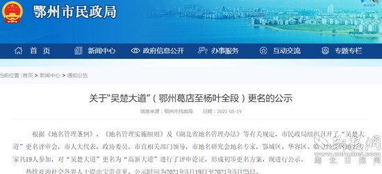 荊楚網(wǎng)(湖北日報網(wǎng))訊(記者熊子璇)“吳楚大道”擬更名為“高新大道”!5月19日,鄂州市民政局對“吳楚大道”(鄂州葛店至楊葉全段)擬更名進行公示。