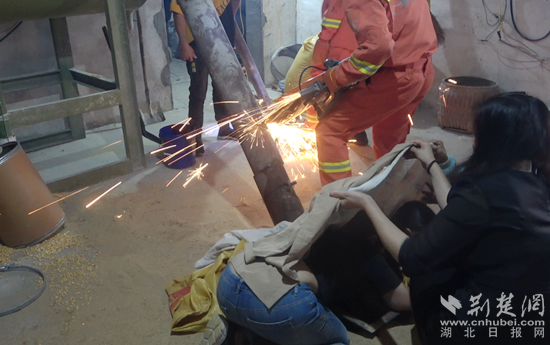 消防救援人員在現(xiàn)場發(fā)現(xiàn),小孩右手被卷入正在運轉(zhuǎn)的進飼料攪拌機的轉(zhuǎn)軸當(dāng)中,無法動彈。因飼料攪拌機結(jié)構(gòu)較復(fù)雜,且孩子右手卡得很緊,消防員用衣服遮擋好孩子,采用鋸子小心翼翼地將飼料攪拌機輸送筒鋸斷,將機器底座分離。開辟救援空間后,消防員對機器底座進行破拆,幼童家長則在一邊安撫孩子。經(jīng)過近1個小時的緊張施救,幼童的右手終于脫困,經(jīng)現(xiàn)場醫(yī)務(wù)人員簡單處理后,孩子立刻被送往醫(yī)院接受救治。