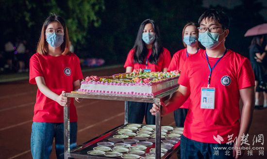當(dāng)食品科學(xué)與工程專業(yè)學(xué)生在實(shí)驗(yàn)室自制的1.2米長、0.6米寬的方形大蛋糕徐徐推向臺(tái)前,校黨委副書記、校長陳向軍在一片歡呼聲中切開蛋糕,現(xiàn)場(chǎng)氣氛被推向高潮,現(xiàn)場(chǎng)兩千余名學(xué)生舉著手中的蛋糕,在主持人的帶動(dòng)下,齊唱《生日歌》,并高呼“祝偉大的中國共產(chǎn)黨一百歲生日快樂”。