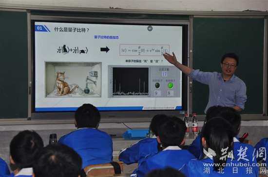 圖為中科院研究員許鵬圍繞“量子計算的前沿進(jìn)展”主題給鄂州師生釋疑解惑。通訊員供圖