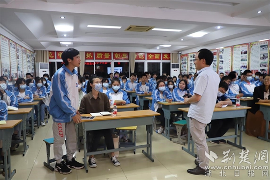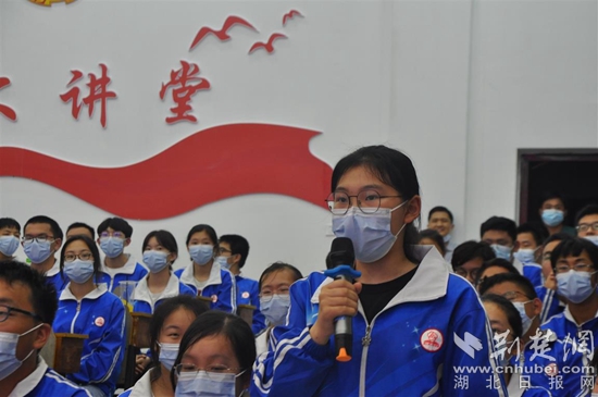 圖為鄂州高中報告大廳,學(xué)生們在聆聽《航天飛行器現(xiàn)狀和未來》科普報告后,現(xiàn)場提問并與專家互動交流。通訊員供圖