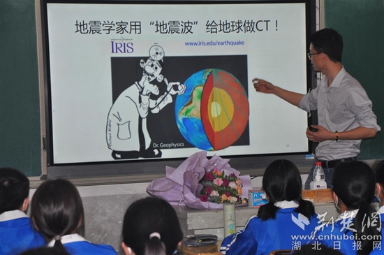 圖為中科院精密測量院副研究員崇加軍給鄂州師生講授“地震與地震預(yù)警”相關(guān)知識。通訊員供圖