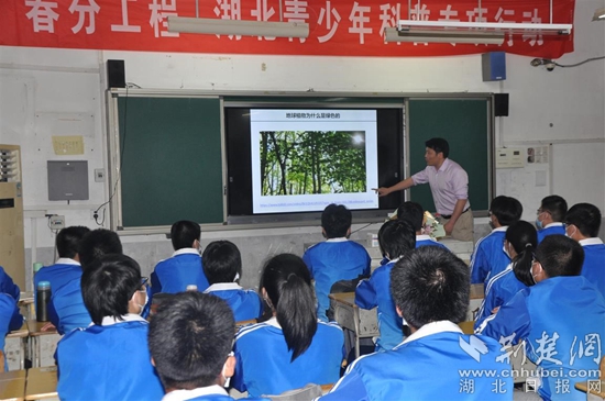 圖為華中科技大學(xué)教授王鵬圍繞“尋找生命的痕跡:拉曼光譜淺談”主題為鄂州師生作科普報告。通訊員供圖