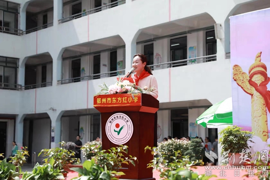 圖為鄂州市東方紅小學(xué)校黨支部書(shū)記、校長(zhǎng)夏蕓致辭。(通訊員供圖)