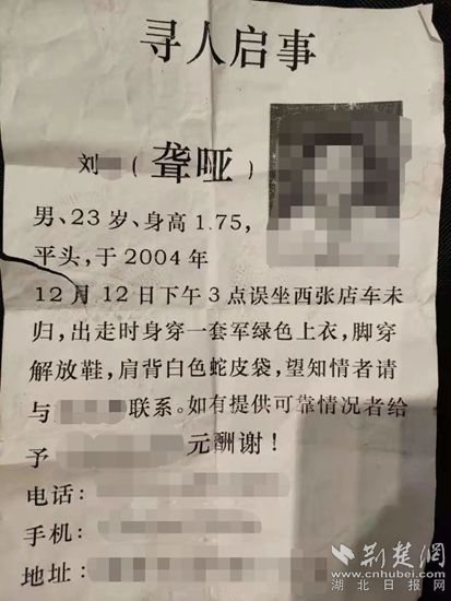 2004年12月12日,一個普通的日期,但對劉某的家人來說,這個日子卻讓他們終生難忘。從小在農(nóng)村長大的聾啞小伙劉某,在乘坐客車回老家福田河的途中因搭錯車,去往了麻城西張店(現(xiàn)屬順河鎮(zhèn)),后與家人失聯(lián)。17年來,父母和家人每年都通過各種方法尋人,張貼尋人啟事、電視臺、媒體尋找……但一直沒有消息,帶他出門的奶奶萬分自責(zé),甚至多次產(chǎn)生輕生的念頭,他的父親更是滿頭白發(fā),令人心疼。