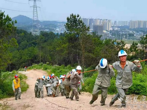 荊楚網(wǎng)(湖北日?qǐng)?bào)網(wǎng))訊(通訊員王劍)6月9日,烈日炎炎,在湖北鄂州水月村附近的大山之間,鄂州供電公司30余名電網(wǎng)建設(shè)人員沿著陡峭的山道肩拉背扛,如螞蟻搬家一般搬運(yùn)塔材,一座4萬(wàn)斤重的鐵塔由山腳轉(zhuǎn)運(yùn)至山巔。