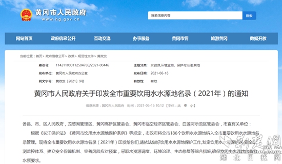 《黃岡市人民政府關于印發(fā)全市重要飲用水水源地名錄(2021年)的通知》。來源:黃岡市人民政府官網(wǎng)