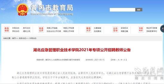 荊楚網(wǎng)(湖北日報網(wǎng))訊(記者熊子璇 )6月15日,黃岡市教育局官網(wǎng)發(fā)布最新招聘教師公告:湖北應急管理職業(yè)技術學院公開招聘60名教師,部分崗位專科生可報名參加。
