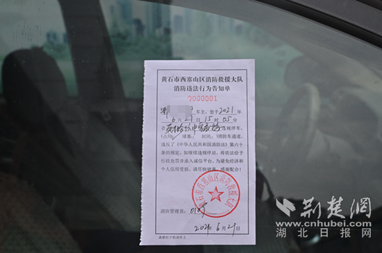 “該機(jī)動(dòng)車(chē)在上述時(shí)間、地點(diǎn)違規(guī)停車(chē),占用/堵塞/封閉 消防車(chē)通道,違反了《中華人民共和國(guó)消防法》第六十條的規(guī)定。如繼續(xù)違規(guī)停放,將依法給予行政處罰并錄入誠(chéng)信平臺(tái)。為避免經(jīng)濟(jì)和個(gè)人信用受損,請(qǐng)盡快駛離,感謝配合!” 除了上訴內(nèi)容,這張由西塞山區(qū)消防救援大隊(duì)出具的《消防違法行為告知單》上還有車(chē)牌號(hào),占用時(shí)間及地點(diǎn)等信息。