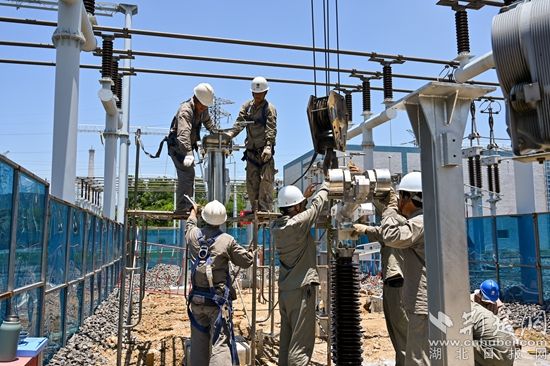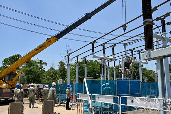 荊楚網(湖北日報網)訊( 通訊員王軍 龍菲)6月22日,在黃石新港海洲大道以北,中國有色礦業(yè)集團有限公司“大冶有色40萬噸高純陰極銅清潔生產項目”建設如火如荼,在相距不到300米的220千伏韋源口變電站,20多名電力工人冒著高溫在有序的吊裝新刀閘,為大客戶新增電源點。
