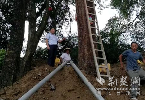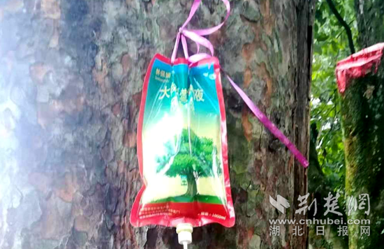 24日,通山林業(yè)局的工作人員已為重新樹立的這株古樹掛上了點(diǎn)滴,打上了營(yíng)養(yǎng)針。