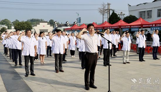 黃岡市中心醫(yī)院黨委書(shū)記熊雙林帶領(lǐng)70余名醫(yī)護(hù)專(zhuān)家重溫入黨誓詞。記者胡小軍 攝