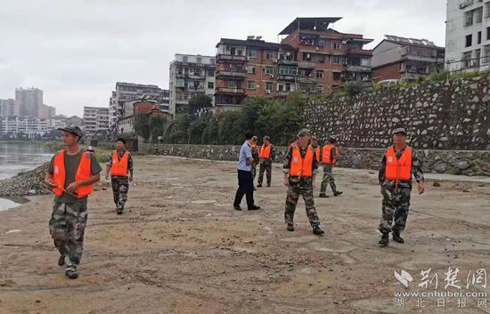 溫泉鎮(zhèn)政府民兵連隊(duì)在河道進(jìn)行防汛巡堤活動(dòng)。通訊員 供圖