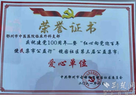 鄂州市中醫(yī)醫(yī)院臨床外科黨支部被授予最佳“愛(ài)心單位”。(通訊員供圖)
